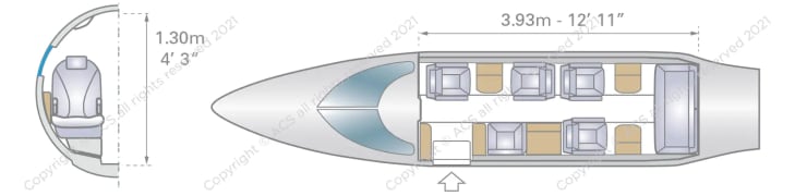 - While interior layouts vary, the aircraft typically seats seven passengers. A smaller eighth passenger (such as a child) can sit in the middle of the rear divan.