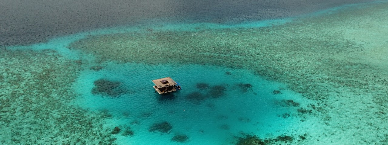 Anchored within an azure marine conservation area surrounded by coral, this ingenious floating structure has three levels. Above the water you’ll find a rooftop sundeck for sunbeds and stargazing, followed by a sea-level lounge and bathroom. Below the surface, the magical submariner bedroom encapsulates guests in a turquoise bubble with glorious views of the seabed as colourful fish drift past.